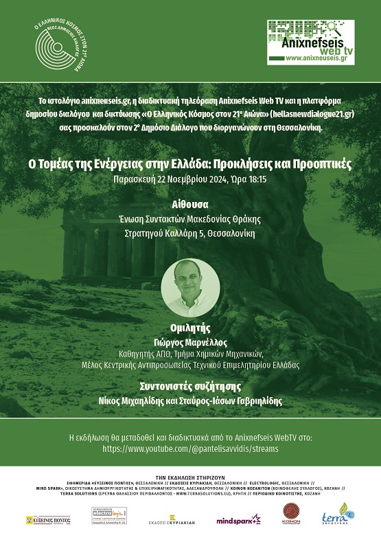 Η πλατφόρμα "Ο ελληνικός κόσμος στον 21ο αιώνα" (hellasnewdialogue21.gr) σε συνεργασία με το ιστολόγιο Anixneuseis.gr διοργανώνει και σας προσκαλεί στον 2ο Δημόσιο Διάλογο στη Θεσσαλονίκη με θέμα την ηλεκτρική ενέργεια στην Ελλάδα και συγκεκριμένα στην Ένωση Συντακτών Μακεδονίας – Θράκης (Στρατηγού Καλλάρη 5), στο κέντρο της Θεσσαλονίκης, κοντά στο Λευκό Πύργο.