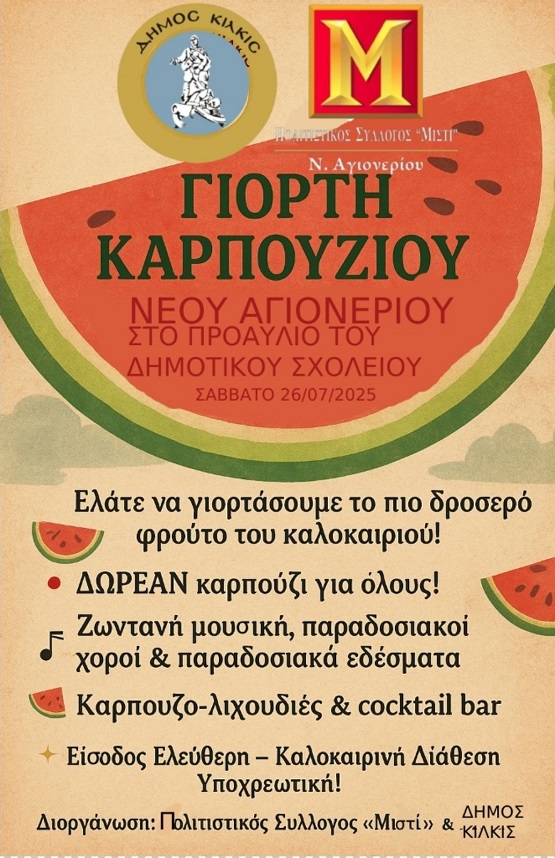 Ο Δήμος Κιλκίς, η Δημοτική Κοινότητα Νέου Αγιονερίου και ο Πολιτιστικός Σύλλογος “Μιστί” αναδεικνύουν την εκλεκτή τοπική παραγωγή και διοργανώνουν το Σάββατο 26 Ιουλίου τη Γιορτή Καρπουζιού στον προαύλειο χώρο του Δημοτικού Σχολείου Νέου Αγιονερίου Κιλκίς.