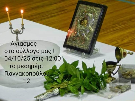 Ο πρόεδρος και το Διοικητικό Συμβούλιο του συλλόγου μας σας προσκαλούν στον Αγιασμό του συλλόγου μας, που θα τελεστεί στις εγκαταστάσεις μας Γιαννακοπούλου 12, Αμπελόκηποι, το Σάββατο 4 Οκτωβρίου 2025 και ώρα 12:00 το μεσημέρι.