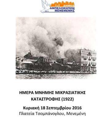 Ο δήμος Αμπελοκήπων – Μενεμένης του νομού Θεσσαλονίκης, το πρωί της Κυριακής 18 Σεπτεμβρίου 2016 πρόκειται να τιμήσει την Ημέρα Μνήμης Μικρασιατικής Καταστροφής με σχετική δοξολογία, επιμνημόσυνη δέηση και κατάθεση στεφάνων που θα πραγματοποιηθούν στον Ιερό Ναό Αγίας Παρασκευής Μενεμένης και στην παρακείμενη Πλατεία Τσομπάνογλου στη Μενεμένη.