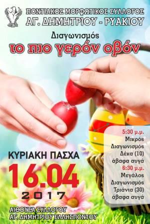 Διαγωνισμό αυγοτσουγκρίσματατος για «το πιο γερόν οβόν», θα γίνει την Κυριακή του Πάσχα, 16 Απριλίου 2017, από τον ποντιακό μορφωτικό σύλλογο Αγίου Δημητρίου – Ρυακίου του νομού Κοζάνης.