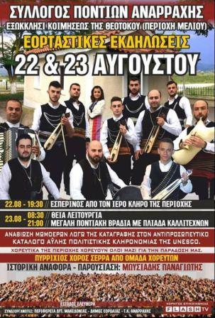 Διήμερο εορταστικών εκδηλώσεων πραγματοποιεί ο σύλλογος Ποντίων Αναρράχης την Τρίτη 22 και την Τετάρτη 23 Αυγούστου 2017, στο εξωκκλήσι Κοιμήσεως της Θεοτόκου (περιοχή Μελιού).