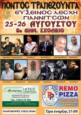 Διήμερο εκδηλώσεων με το γενικό τίτλο «Πόντος – Τραπεζούντα», πραγματοποιεί η Εύξεινος Λέσχη Γιαννιτσών, την Παρασκευή 25 και την Κυριακή 26 Αυγούστου 2017.