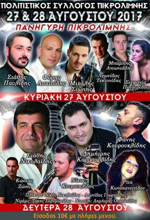 Διήμερο πανηγύρι στην Πικρολίμνη του Κιλκίς, διοργανώνει ο πολιτιστικός σύλλογος Πικρολίμνης Κιλκίς, την Κυριακή 27 Αυγούστου και την Δευτέρα 28 Αυγούστου 2017.