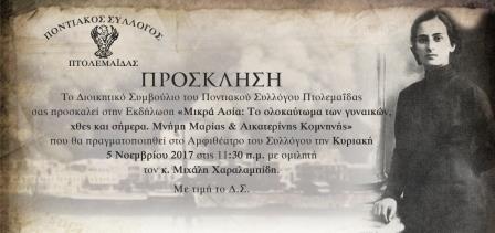 Συγκεκριμένα ο σύλλογος Ποντίων Πτολεμαΐδας, διοργανώνει την Κυριακή 5 Νοεμβρίου 2017, στις 11 το πρωί, στο αμφιθέατρο του συλλόγου εκδήλωση με κεντρικό ομιλητή των Μιχάλη Χαραλαμπίδη, με θέμα «Μικρά Ασία. Το Ολοκαύτωμα των γυναικών, χθες και σήμερα. Μνήμη Μαρίας και Αικατερίνης Κομνηνής».