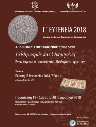 Διεθνές Επιστημονικό συνέδριο, με θέμα «Ελληνισμός και Οικουμένη. Άγιος Ευγένιος ο Τραπεζούντιος. Θεολογία – Ιστορία – Τέχνη», θα πραγματοποιηθεί στη Θεσσαλονίκη, με πρωτοβουλία της Ιεράς Μητροπόλεως Νέας Κρήνης και Καλαμαριάς, την Πέμπτη 18, την Παρασκευή 19, το Σάββατο 20 και θα ολοκληρωθεί την Κυριακή 21 Ιανουαρίου 2018.