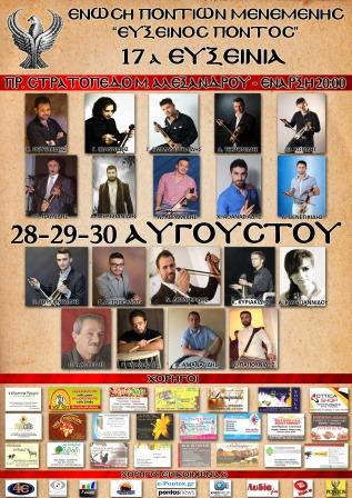 Τριήμερες πολιτιστικές εκδηλώσεις με γενικό τίτλο «17α ΕΥΞΕΙΝΙΑ» πραγματοποιεί η Ένωση Ποντίων Μενεμένης «ΕΥΞΕΙΝΟΣ ΠΟΝΤΟΣ», την Παρασκευή 28, το Σάββατο 29 και την Κυριακή 30 Αυγούστου 2015 στο χώρο του πρώην στρατοπέδου «Μεγάλου Αλεξάνδρου» του δήμου Αμπελοκήπων Μενεμένης.