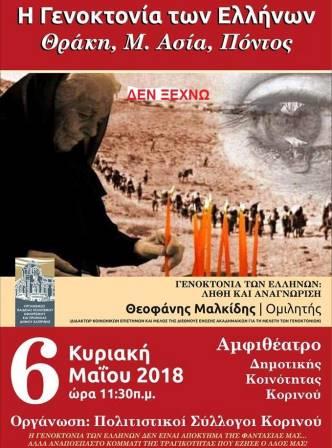 Εκδήλωση με θέμα «Η Γενοκτονία των Ελλήνων. Θράκη, Μικρά Ασία, Πόντος», διοργανώνουν οι πολιτιστικοί σύλλογοι Κορινού Πιερίας, σε συνεργασία με Οργανισμό Παιδείας, Πολιτισμού, Αθλητισμού και Πρόνοιας του δήμου Κατερίνης, και προσκαλούν όλους τους κατοίκους της περιοχής και της Μακεδονίας, να παρευρεθούν και να τιμήσουν με την παρουσία τους.