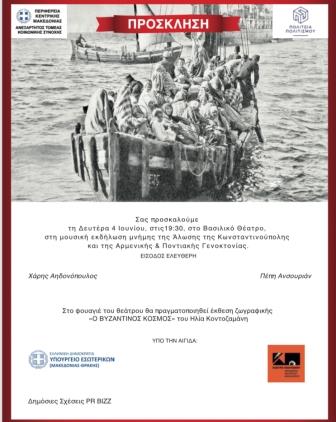 Μουσική εκδήλωση μνήμης, με τίτλο «Ποτέ ξανά», συνδιοργανώνουν ο Τομέας Κοινωνικής Συνοχής της Περιφέρειας Κεντρικής Μακεδονίας και η «Πολιτεία Πολιτισμού», τη Δευτέρα 4 Ιουνίου 2018, στις 19.30, στο Βασιλικό Θέατρο, στη Θεσσαλονίκη. Η συναυλία, που τελεί υπό την αιγίδα του Υπουργείου Εσωτερικών (Μακεδονίας - Θράκης) και του Κέντρου Πολιτισμού της Περιφέρειας Κεντρικής Μακεδονίας, είναι αφιερωμένη στην Άλωση της Κωνσταντινούπολης, τη Γενοκτονία των Ποντίων και τη Γενοκτονία των Αρμενίων. Η είσοδος για το κοινό είναι ελεύθερη.