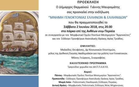 Εκδήλωση με θέμα «Μνήμη Γενοκτονίας Ελλήνων κι Ελληνίδων», Πόντος - Θράκη, Μικρά Ασία, Καππαδοκία, θα πραγματοποιηθεί για δεύτερη συνεχόμενη χρονιά, στην Περαία του Δήμου Θερμαϊκού Θεσσαλονίκης,στο πάρκο επί της οδού Ανθέων,το Σάββατο 2 Ιουνίου 2018,στις 20.00.