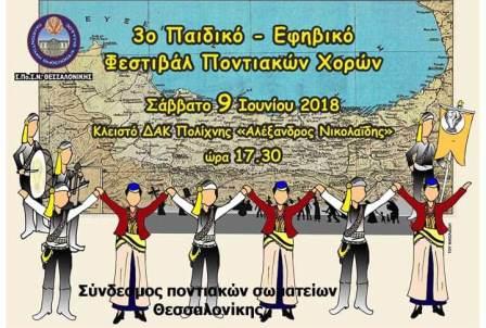 Σύμφωνα με ανακοίνωση του ΣΠΟΣ Θεσσαλονίκης της ΠΟΕ, την οποία υπογράφουν εκ μέρους του διοικητικού συμβουλίου ο πρόεδρος Θεόδωρος Κουνατίδης και ο γενικός γραμματέας Ιωακείμ Χατζηθεοδωρίδης, το «3ο Φεστιβάλ Ποντιακών Χορών Παιδικών και Εφηβικών Συγκροτημάτων, θα πραγματοποιηθεί το Σάββατο 9 Ιουνίου 2018 στις 17:30 στο κλειστό Δ.Α.Κ Πολίχνης ‘Αλέξανδρος Νικολαΐδης’ (τέρμα Αγνώστου Στρατιώτου, Άλσος Πολίχνης, Δήμος Παύλου Μελά)».