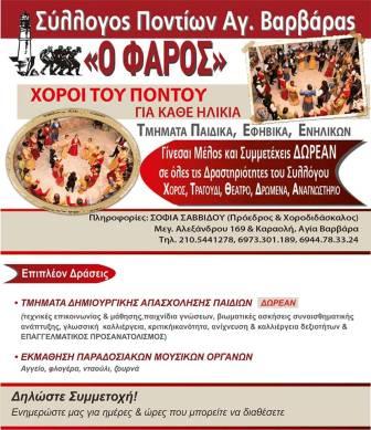 Όπως αναφέρεται σε ανακοίνωση του συλλόγου Ποντίων Αγίας Βαρβάρας «"Ο ΦΑΡΟΣ" ανοίγει την "αγκαλιά" του και σας υποδέχεται στην αίθουσά του, την Παρασκευή 5 Οκτωβρίου 2018 και ώρα 8 μμ.