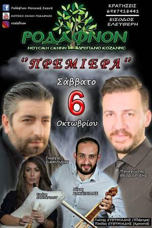 Η έναρξη της χειμερινής λειτουργίας της μουσικής σκηνής «Ροδάφνον», θα γίνει με την πρεμιέρα το Σάββατο 6 Οκτωβρίου 2018, στο Δρέπανο του νομού Κοζάνης, με πλούσιο καλλιτεχνικό ποντιακό πρόγραμμα.