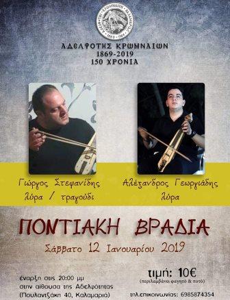 Ποντιακή βραδιά διοργανώνει η Αδελφότητα Κρωμναίων το Σάββατο 12 Ιανουαρίου 2018, στην αίθουσα εκδηλώσεών της, στην οδό Πουλαντζάκη 40, στην Καλαμαριά της Θεσσαλονίκης.