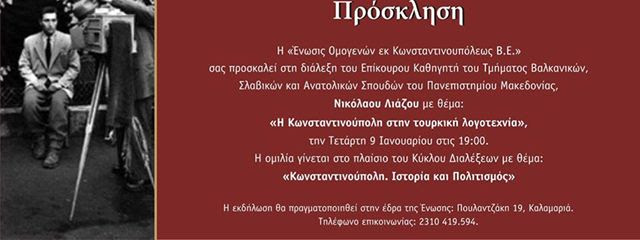 Εκδήλωση με θέμα «Η Κωνσταντινούπολη στην τουρκική λογοτεχνία», θα πραγματοποιηθεί στο πλαίσιο του κύκλου διαλέξεων με γενικό θέμα «Κωνσταντινούπολη. Ιστορία και Πολιτισμός», με πρωτοβουλία της Ένωσης Ομογενών Εκ Κωνσταντινουπόλεως Βορείου Ελλάδος.