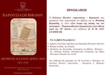 Το βιβλίο του Θεοδόση Αρ. Κυριακίδη με τίτλο «Στο όνομα της πίστης και του πολιτισμού - Ρωμαιοκαθολικές Ιεραποστολές στον Πόντο κατά τον 19ο αιώνα», θα παρουσιαστεί στην Αθήνα την Πέμπτη 10 Ιανουαρίου 2019.