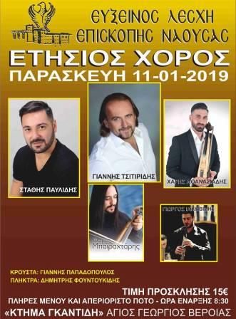 Τον ετήσιο χορό της διοργανώνει η Εύξεινος Λέσχη Επισκοπής Νάουσας και προσκαλεί τα μέλη και τους φίλους να παρευρεθούν και να γλεντήσουν όλοι μαζί την Παρασκευή 11 Ιανουαρίου 2019, στις 8:30 μ.μ. στο Κτήμα Γκαντίδη, στον Άγιο Γεώργιο της Βέροιας.
