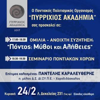 Όπως αναφέρεται σε ανακοίνωση του Ποντιακού Πολιτιστικού Οργανισμού «Πυρρίχιος Ακαδημία», την Κυριακή 24 Φεβρουαρίου, από τις 17.00 έως τις 18.30 θα πραγματοποιηθεί ομιλία - ανοιχτή συζήτηση με θέμα «Πόντος: Μύθοι και Αλήθειες», και από τις 18.30 έως τις 19.30, σεμινάριο ποντιακών χορών. Επίτιμος καλεσμένος θα είναι ο Παντελής Καραλευτέρης, πρώην μέλος του διοικητικού συμβουλίου της ΔΙΣΥΠΕ και χοροδιδάσκαλος.