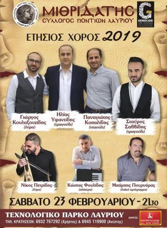 Τον ετήσιο χορό του διοργανώνει ο σύλλογος Ποντίων Λαυρίου «ΜΙΘΡΙΔΑΤΗΣ» το Σάββατο 23 Φεβρουαρίου 2019, στο Τεχνολογικό Πάρκο Λαυρίου και με ανακοίνωσή του το διοικητικό συμβούλιο, προσκαλεί τα μέλη και τους φίλους του συλλόγου, να πάρουν μέρος και να γλεντήσουν στους ρυθμούς του αλησμόνητου Πόντου.