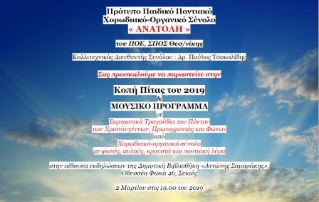 Την κοπή της πίτας της κόβει, με πλούσιο μουσικό πρόγραμμα με τραγούδια του Πόντου, των Χριστουγέννων, Πρωτοχρονιάς και Φώτων, το πρότυπο παιδικό ποντιακό χορωδιακό – οργανικό σύνολο «ΑΝΑΤΟΛΗ», του Συνδέσμου Ποντιακών Σωματείων Θεσσαλονίκης, της Παμποντιακής Ομοσπονδίας Ελλάδος, που λειτουργεί με τη διεύθυνση του καλλιτεχνικού διευθυντή του συλλόγου δρ Παύλου Τσακαλίδη.