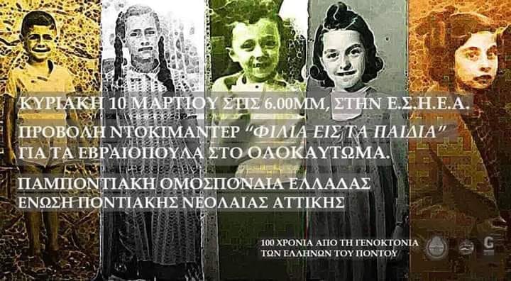 Η Παμποντιακή Ομοσπονδία Ελλάδoς και το πρωτοβάθμιο σωματείο της, η Ένωση Ποντιακής Νεολαίας Αττικής προβάλουν την Κυριακή 10 Μαρτίου 2019, και ώρα 18:00, στην αίθουσα της Ένωσης Συντακτών Ημερήσιων Εφημερίδων Αθηνών - Ε.Σ.Η.Ε.Α. (Ακαδημίας 20, Αθήνα) το ντοκιμαντέρ «Φιλιά εις τα παιδιά».