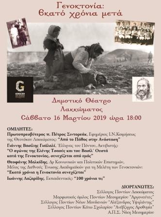 Στο πλαίσιο αυτό οι Σύλλογοι: Σύλλογος Ποντίων Λακκώματος. Μορφωτικός όμιλος Ποντίων Μεσημερίου «Αργοναύτες». Σύλλογος Ποντίων Νέων Μουδανιών «Αλέξανδρος Υψηλάντης». Σύλλογος Ποντίων Κάτω Σχολαρίου «Ανέβζηγος Αροθυμία». Α. Π. Σ. «Νίκη Μεσημερίου», διοργανώνουν Σάββατο 16 Μαρτίου 2019, και ώρα 18.00, στο Δημοτικό Θέατρο Λακκώματος, την εκδήλωση, «Γενοκτονία: Εκατό χρόνια μετά».