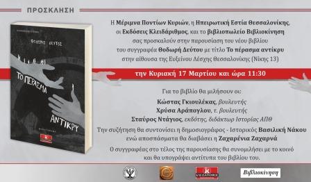 Το βιβλίο του Θοδωρή Δεύτου «Το πέρασμα αντίκρυ» παρουσιάσουν στο κοινό της Μακεδονίας, η Μέριμνα Ποντίων Κυριών, η Ηπειρωτική Εστία Θεσσαλονίκης, οι εκδόσεις Κλειδάριθμος και το βιβλιοπωλείο Βιβλιοκίνηση, την Κυριακή 17 Μαρτίου 2019, στις 11.30 το πρωί, στην αίθουσα εκδηλώσεων της Ευξείνου Λέσχης Θεσσαλονίκης.