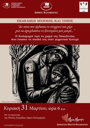 Εκδήλωση μνήμης πραγματοποιείται την Κυριακή 31 Μαρτίου 2019, στις 6 το βράδυ στο δημοτικό Θέατρο «Μελίνα Μερκούρη» (Μεταμορφώσεως και Αργυρουπόλεως γωνία), με ελεύθερη είσοδο για το κοινό, όπου η Καλαμαριά τιμά τα χωριά της Μακεδονίας που έσωσαν τα παιδιά της από την πείνα και τον θάνατο στη διάρκεια της γερμανικής Κατοχής, και όπως έγραψε μια μάνα που έστειλε το παιδί της να σωθεί στα προσφυγοχώρια και ποντιοχώρια της Μακεδονίας, «Σε σένα που άπλωσε το στοργικό σου χέρι για ν’ αγκαλιάσεις το ξενιτεμένο μου μικρό».