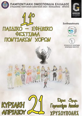 Όπως αναφέρεται σε ανακοίνωση του Συνδέσμου Ποντιακών Σωματείων Ανατολικής Μακεδονίας και Θράκης της ΠΟΕ, την οποία εκ μέρους του διοικητικού συμβουλίου υπογράφουν ο πρόεδρος Γρηγόρης Κεσαπίδης και η γενική γραμματέας Αθηνά Νακούση, «το 11ο Παιδικό - Εφηβικό Φεστιβάλ Ποντιακών Χορών θα πραγματοποιηθεί την Κυριακή 21 Απριλίου 2019 και ώρα 17:00 στην Χρυσούπολη, στο Κλειστό Δημοτικό Γυμναστήριο Χρυσούπολης. Χορευτές των σωματείων του Έβρου, της Ροδόπης, της Ξάνθης, της Καβάλας και της Δράμας θα ενώσουν τα χέρια τους και ως μια αδιάσπαστη ενότητα, θα περάσουν το δικό τους μήνυμα ελπίδας, αισιοδοξίας και ενότητας.