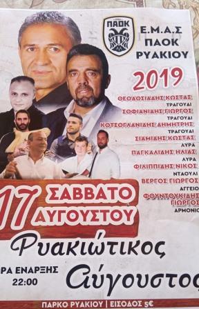 Ο Ρυακιώτικος Δεκαπενταύγουστος, μια καθιερωμένη εκδήλωση από τις αρχές της δεκαετίας του 1980, αναμένεται να πραγματοποιηθεί και φέτος, όχι όμως την παραμονή της Παναγίας όπως γίνονταν συνήθως κάθε χρόνο, αλλά το Σάββατο 17 Αυγούστου 2019.