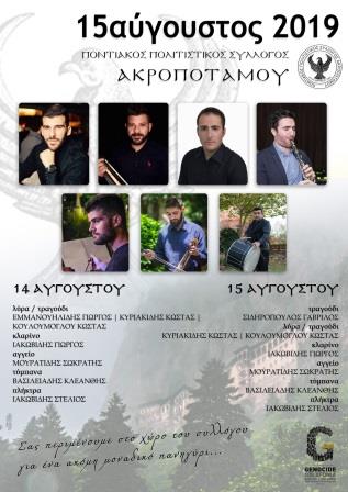 Διήμερες πολιτιστικές εκδηλώσεις με τον γενικό τίτλο «Δεκαπενταύγουστος 2019», με πλούσιο καλλιτεχνικό ποντιακό πρόγραμμα διοργανώνονται την Τετάρτη παραμονή του Δεκαπενταύγουστου 14 και την Πέμπτη 15 Αυγούστου 2019, στον Ακροπόταμο Θεσσαλονίκης.