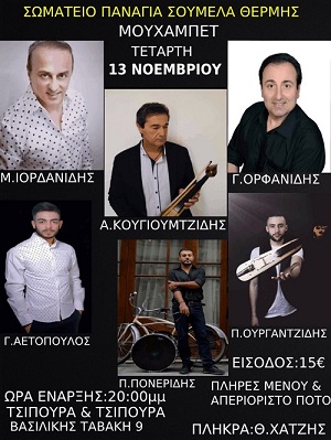Το μουχαπέτ’ του σωματείου Παναγία Σουμελά Δήμου Θέρμης, θα πραγματοποιηθεί την Τετάρτη 13 Νοεμβρίου 2019, με ώρα έναρξης 20:00 στην Ταβέρνα «Τσιπούρα & Τσίπουρα», Βασ. Ταβάκη 9 στην Θέρμη.