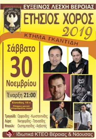 Το Σάββατο 30 Νοεμβρίου 2019 στις 9 το βράδυ, θα πραγματοποιηθεί ο ετήσιος χορός των μελών και φίλων της Ευξείνου Λέσχης Βέροιας. Τα μέλη των τμημάτων μαζί με τους υπευθύνους και τους συνεργάτες τους θα συναντηθούν στην πανέμορφη και φιλόξενη αίθουσα δεξιώσεων «Κτήμα Γκαντίδη» στο 3ο χιλιόμετρο της οδού Πατρίδας - Αγίου Γεωργίου, όπου θα παρουσιάσουν ένα παραδοσιακό ποντιακό πρόγραμμα με πολλές εκπλήξεις.