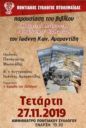 Το βιβλίο του Ιωάννη Κων. Αμαραντίδη «Θανατικά Ανάσματα σα σχιόνια τ’ Ερζερουμή» θα παρουσιαστεί με πρωτοβουλία του Συλλόγου Ποντίων Πτολαμαΐδας, το οποίο αναφέρεται στα βάσανα του ποντιακού ελληνισμού στην αλησμόνητη Πατρίδα του Πόντου.