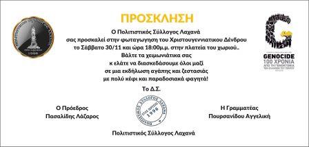 Όπως αναφέρεται σε ανακοίνωση του πολιτιστικού συλλόγου Λαχανά, την οποία εκ μέρους του διοικητικού συμβουλίου υπογράφουν ο πρόεδρος Λάζαρος Πασαλίδης και η γενική γραμματέας Αγγελική Πουρσανίδου, «ο πολιτιστικός σύλλογος Λαχανά, σας προσκαλεί στην φωταγώγηση του Χριστουγεννιάτικου Δένδρου, το Σάββατο 30 Νοεμβρίου 2019, και ώρα 18.00 στην πλατεία του χωριού.