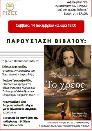 Για το βιβλίο θα μιλήσουν ο ιστορικός και αντιπρόεδρος του Πολιτιστικού Κέντρου «Ρίζες» Κώστας Δημητριάδης, η επίκουρη καθηγήτρια της Έδρας Ρωσικής Γλώσσας και Πολιτισμού του Αριστοτελείου Πανεπιστημίου Θεσσαλονίκης Τατιάνα Τριανταφυλλίδου και η συγγραφέας Γιώτα Τσαρμποπούλου. Μουσικά θα επενδύσει την εκδήλωση η γνωστή τραγουδίστρια Μήδεια Χουρσουλίδου.