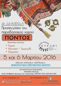 Το Κέντρο Μελέτης Παραδοσιακών Χορών «Κύκλος» με την υποστήριξη της Περιφέρειας Κεντρικής Μακεδονίας – Μητροπολιτική Ενότητα Θεσσαλονίκης και του Δήμου Θεσσαλονίκης, διοργανώνει φέτος την 4η Διημερίδα με τίτλο «Προσεγγίσεις του παραδοσιακού χορού: Πόντος».