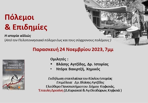 Για 14η χρονιά συνεχίζονται οι συναντήσεις στο Σεμινάριο Ιστορίας , στο πλαίσιο του Ελεύθερου Πανεπιστημίου του Δήμου Κηφισιάς (Δ. Κυριακού και Αγίων Θεοδώρων Κηφισιά) και την Παρασκευή 24 Νοεμβρίου 2023, στις 7.00 μ.μ. θα συζητηθεί η θεματική ενότητα «Πόλεμος και Επιδημίες».