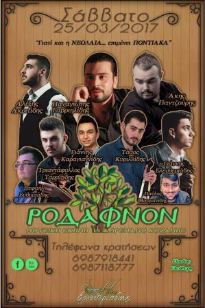 Στο νομό Κοζάνης, η νεολαία στον τρόπο διασκέδασης επιμένει… Ποντιακά. Και η μουσική Σκηνή «ΡΟΔΑΦΝΟΝ», που βρίσκεται στο Δρέπανο του νομού Κοζάνης, το Σάββατο 25 Μαρτίου 2017, δίνει βήμα στα νέα παιδιά της ευρύτερης περιοχής που ασχολούνται με την ποντιακή παράδοση να δημιουργήσουν καλλιτεχνικά.