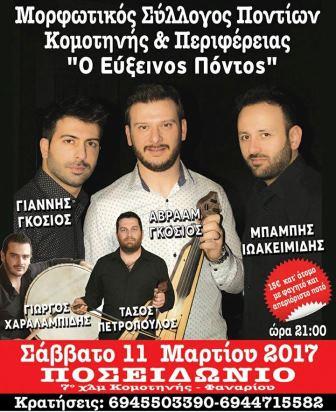 Τον ετήσιο χορό του διοργανώνει ο μορφωτικός σύλλογος Ποντίων Κομοτηνής και περιφέρειας «Ο Εύξεινος Πόντος» το Σάββατο 11 Μαρτίου 2017 και προσκαλεί τα μέλη, τους φίλους και τους κατοίκους της Ροδόπης, αλλά και όλης της Θράκης να παρευρεθούν σε αυτή τη σημαντική εκδήλωση.