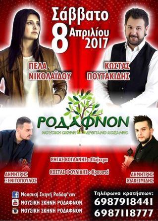 Μία ακόμη μουσική με γνήσια ποντιακή διασκέδαση, προσφέρει η μουσική σκηνή «ΡΟΔΑΦΝΟΝ» στο Δρέπανο Κοζάνης το Σάββατο 8 Απριλίου 2017 και προσκαλεί όλους εκείνους που θέλουν να διασκεδάσουν με ακούσματα και ήχους των αλησμόνητων πατρίδων του Πόντου, να παρευρεθούν σε αυτήν την βραδιά.