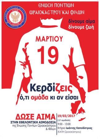 Η Ένωση Ποντίων Ωραιοκάστρου και Φίλων διοργανώνει την 12η Εθελοντική Αιμοδοσία και προσκαλεί τα μέλη και τους φίλους αιμοδότες να συμβάλλουν στην προσπάθεια διατήρησης και ενίσχυσης της τράπεζας αίματος, χαρίζοντας την ελπίδα σε ανθρώπους που το έχουν ανάγκη.