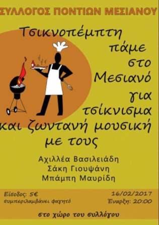 Ένα γνήσιο ποντιακό γλέντι υπόσχονται οι συντελεστές του συλλόγου Ποντίων Μεσιανού Γιαννιτσών στο νομό Πέλλας, την ημέρα της Τσικνοπέμπτης 16 Φεβρουαρίου 2017, έτσι όπως μόνον οι Πόντιοι ξέρουν να γλεντούν.