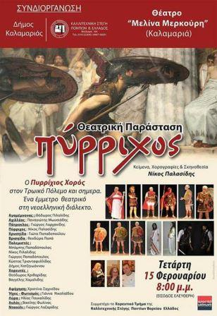 Η θεατρική παράσταση «Πύρριχος», θα ανέβει στη σκηνή του δημοτικού θεάτρου «Μελίνα Μερκούρη» στην Καλαμαριά της Θεσσαλονίκης, την Τετάρτη 15 Φεβρουαρίου 2017, με την συνδιοργάνωση του δήμου Καλαμαριάς και της Καλλιτεχνικής Στέγης Ποντίων Βορείου Ελλάδος, με ελεύθερη είσοδο για το κοινό.