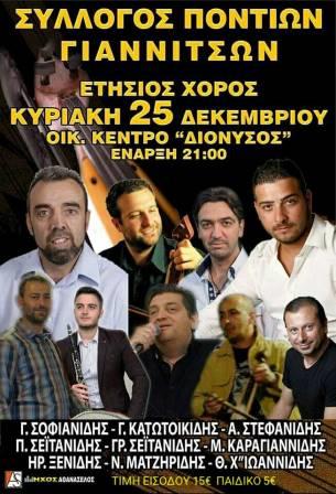 Τον Χριστουγεννιάτικο χορό του διοργανώνει ο σύλλογος Ποντίων Γιαννιτσών και προσκαλεί τα μέλη και τους φίλους να πάρουν μέρος σε αυτήν την εκδήλωση.