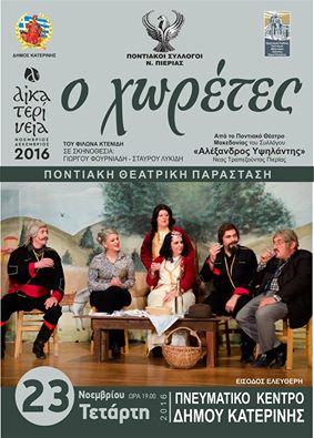 Οι ποντιακοί σύλλογοι του νομού Πιερίας σε συνεργασία με τονΠολιτιστικό Οργανισμό Δήμου Κατερίνης και στα πλαίσια των εκδηλώσεων«ΑΙΚΑΤΕΡΙΝΕΙΑ 2016» θα παρουσιάσουν την ποντιακή θεατρική παράσταση «Ο χωρέτες», από τη θεατρική ομάδα του Ποντιακού Συλλόγου Πιερίας «Αλέξανδρος Υψηλάντης», Νέας Τραπεζούντας Πιερίας.