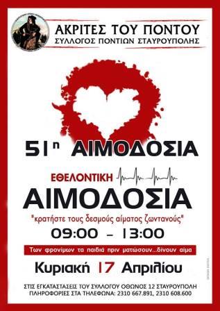Την 51η εθελοντική αιμοδοσία πραγματοποιεί ο σύλλογος Ποντίων Σταυρούπολης «Ακρίτες του Πόντου», την Κυριακή 17 Απριλίου 2016, με τίτλο «κρατήστε τους δεσμούς αίματος ζωντανούς».
