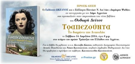 Το βιβλίο του Θοδωρή Δεύτου, «Τραπεζούντα, το διαμάντι της Ανατολής», θα παρουσιαστεί το Σάββατο 16 Απριλίου 2016 στο Αγρίνιο στις 8 το βράδυ, στο κτήριο της πρώην Τράπεζας της Ελλάδος.