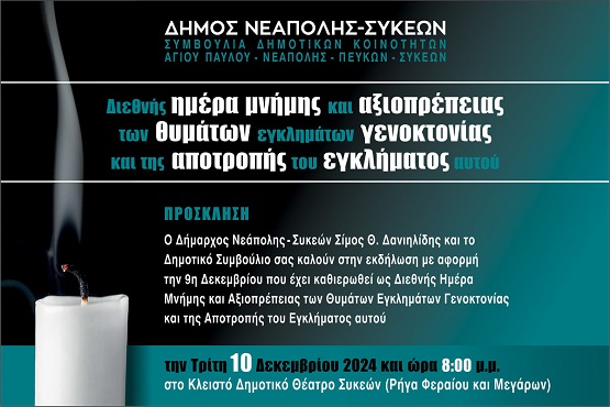Εκδήλωση πραγματοποιεί το βράδυ της Τρίτης 10 Δεκεμβρίου 2024 ο δήμος Νεάπολης - Συκεών τιμώντας τη Διεθνή Ημέρα Μνήμης και Αξιοπρέπειας των θυμάτων Εγκλημάτων Γενοκτονίας και της Αποτροπής αυτού του Εγκλήματος.