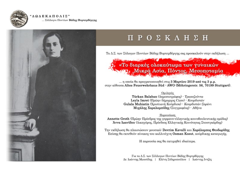 Τις βιαιότητες που διέπραξε διαχρονικά η Οθωμανική Αυτοκρατορία, αλλά και το σύγχρονη τουρκικό κράτος, σε βάρος των γυναικών, θα εξεταστεί στην εκδήλωση με θέμα «το διαρκές ολοκαύτωμα των γυναικών Μικρά Ασία, Πόντος, Μεσοποταμία», που διοργανώνουν οι ποντιακοί σύλλογοι «Δωδεκάπολις» του κρατιδίου της Βάδης Βυδεμβέργης.